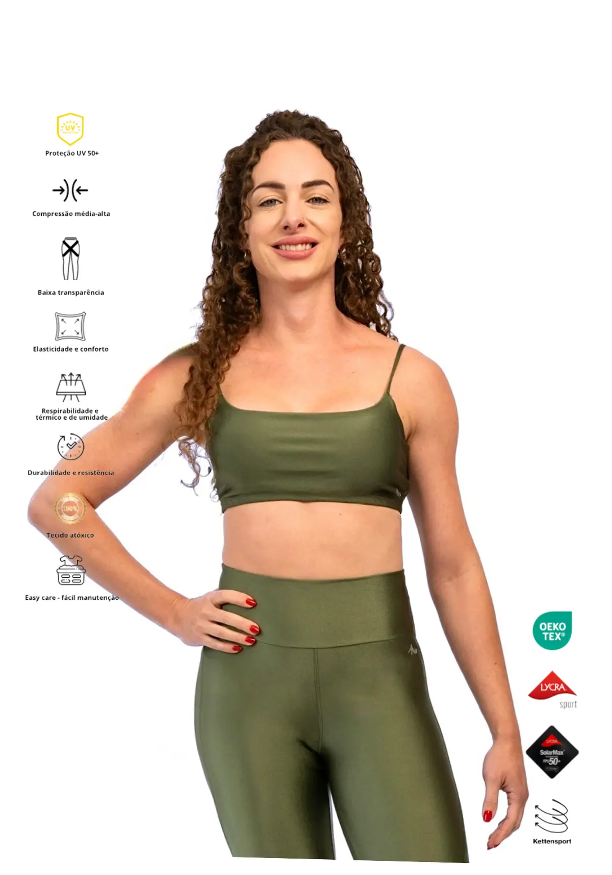 O grande diferencial do nosso Top Verde Floresta reside em seu tecido de alta qualidade, que combina um toque de brilho discreto com funcionalidades extraordinárias: