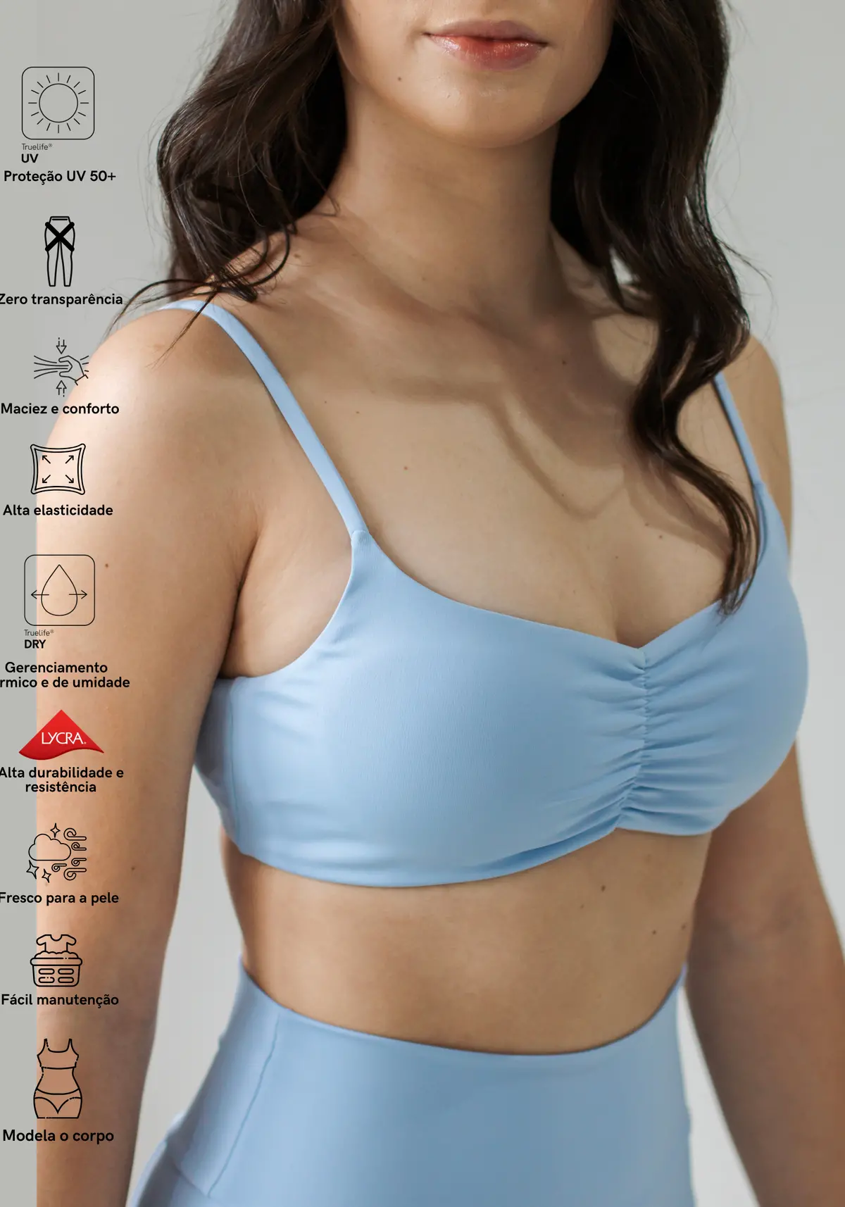 | - | Tecido | Proteção UV 50+, Lycra, Truelife UV, Truelife Dry, Zero Transparência, Disfarça imperfeições, Modela o corpo, Gerenciamento térmico e de umidade, Respirabilidade, Toque fresco e macio, Alta elasticidade e conforto, Easy Care |